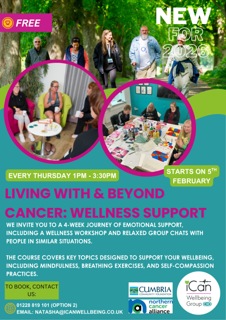 Cancer: Wellness Support, a new free 4-week course designed to support people affected by cancer nurture their emotional wellbeing. Starting Thursday 5th February 2026, the weekly sessions will run every Thursday from 1:00pm – 3:30pm and provide a safe, welcoming space for participants to connect with others who understand what they’re going through.