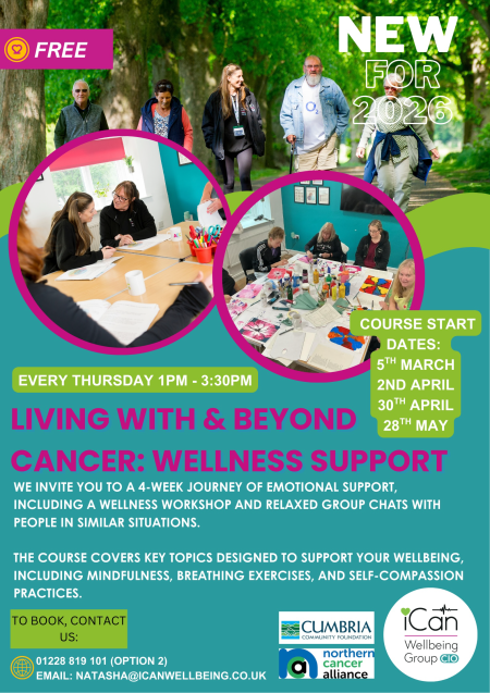 Living with & Beyond Cancer Wellness Support sessions are run by ICan Wellbeing group CIO in their Carlisle wellness space.